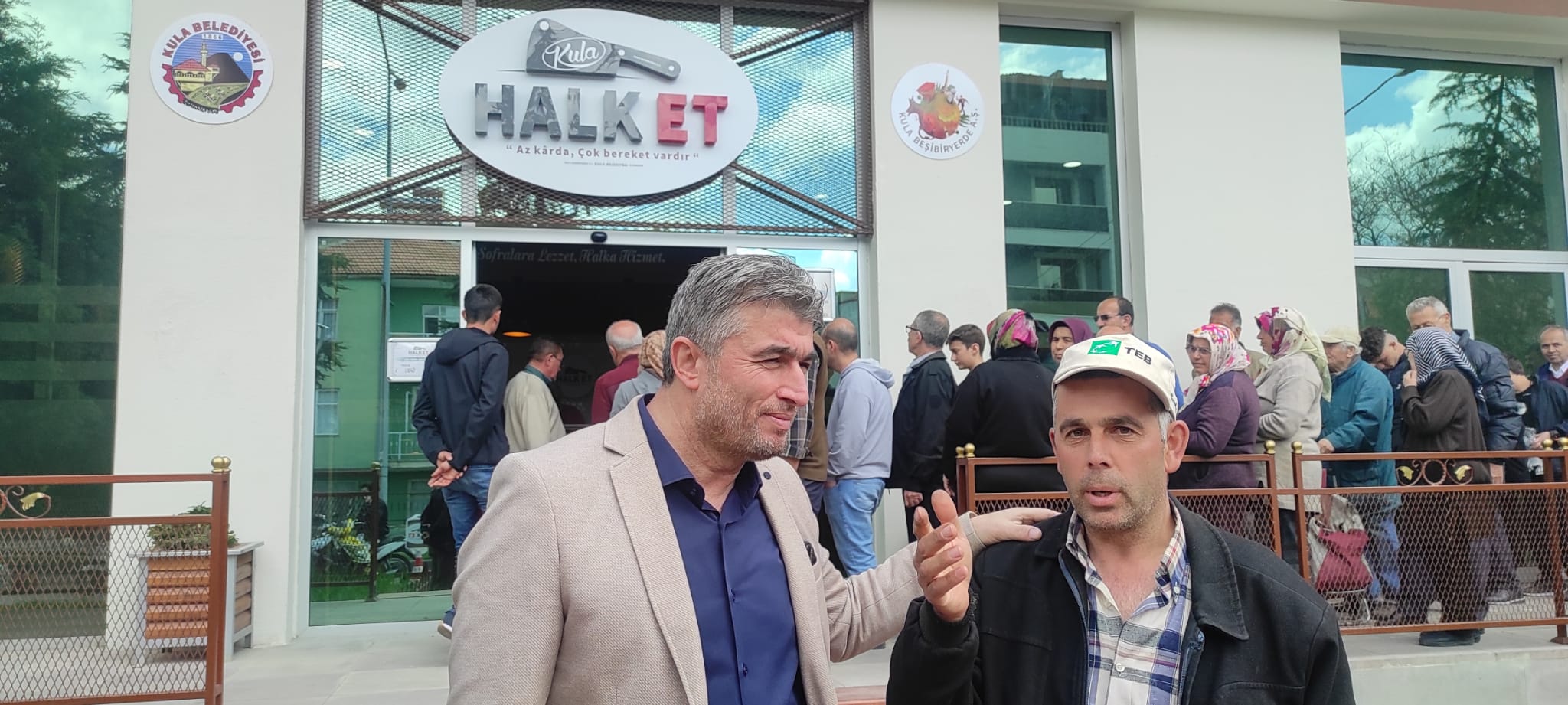Kula belediyesi tarafından bir ay önce açılışı yapılan Kula Halk ete Kulalı vatandaşlar büyük ilgi gösteriyor, Halk ette günlük 250 kg et satışının yapıldığını söyleyen Kula Belediye Başkanı Hüseyin Tosun bir ay önce açtığımız Halk ette Kulalı vatandaşlarımıza kaliteli ve ucuz et satışı yapacağımızı duyurmuştuk birde açılışımıza Kıymanın kg 200 TL, kuşbaşı etin kg da 210 TL olarak belirledik ve bu fiyatları Ramazan ayı sonuna kadar değiştirmeyeceğimizi söylemiştik bu sözümüzde tuttuk.