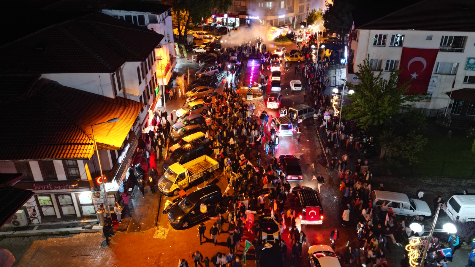 Cumhurbaşkanı Recep Tayyip Erdoğan’ın resmi olmayan sonuçlara göre Cumhurbaşkanı Seçimi ikinci turunu önde tamamlamasının ardından vatandaşlar kutlama yapmak için alanlara indi. Manisa’nın Kula İlçesinde Yunus Emre Kent Meydanında toplanan vatandaşlar, ellerinde Türk bayrakları, AK Parti ve MHP flamaları ve Cumhurbaşkanı Erdoğan’ın posterleriyle sevinç gösterisinde bulundu, sokaklarda zafer yürüyüşü yaptı.