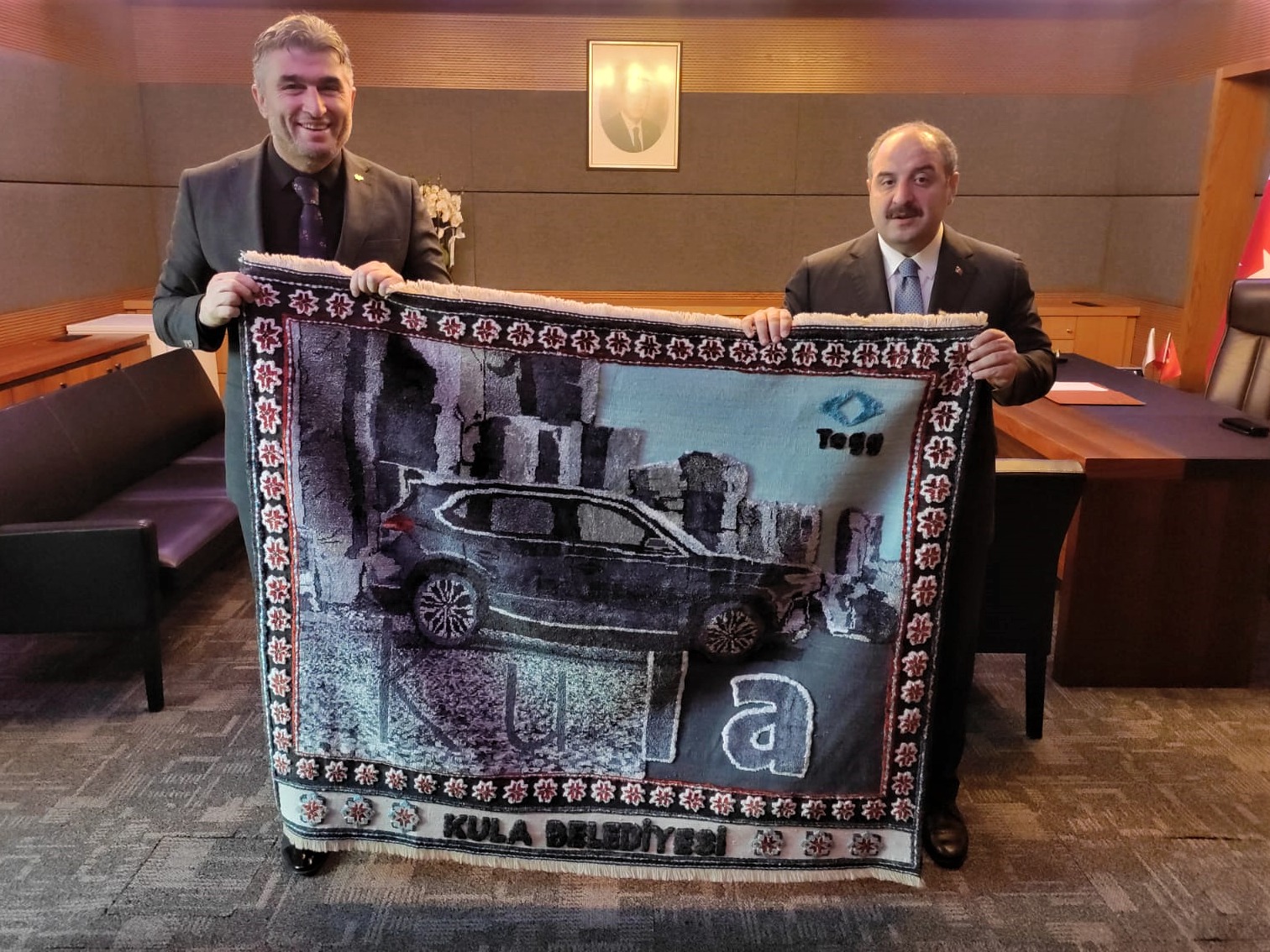 Yerli ve Milli olarak üretilen TOGG otomobillerinin lansman renklerinden birisinin Kula Grisi olmasında büyük emek gayret sahibi olan eski Sanayi ve Teknoloji Bakanı Başkanı Mustafa Varank’a Kula Belediye Başkanı Hüseyin Tosun Kula Grisi renklerinde dokunan halı hediye etti.