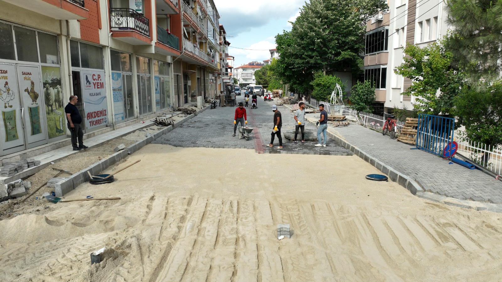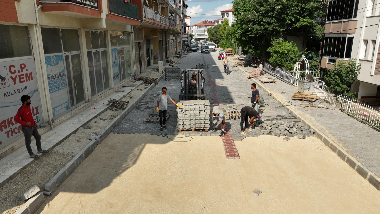 Şehit Mehmet Topcuoğlu Caddesinde devam eden kilit parke taş döşeme çalışmaları Kula Belediyesi ekipleri tarafından hız kesmeden devam ediyor.