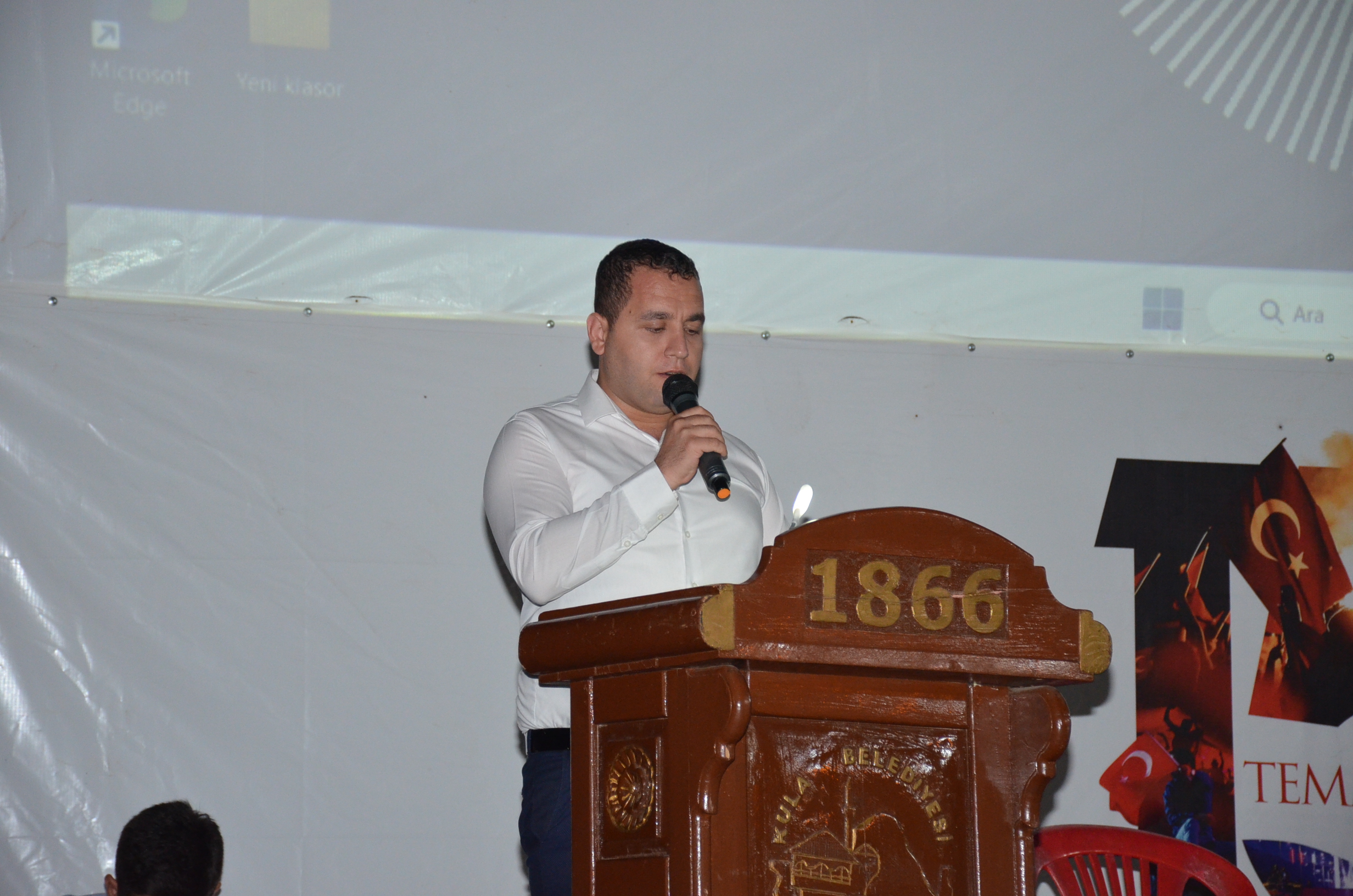 Kula Kent Meydanındaki program Saygı Duruşu ve İstiklal Marşının okunmasıyla başlarken şehitler anısına Kur-an tilaveti okundu. Kula Muharip Gaziler Derneği adına Gazi İsmail Kara konuşmasını yaptı.