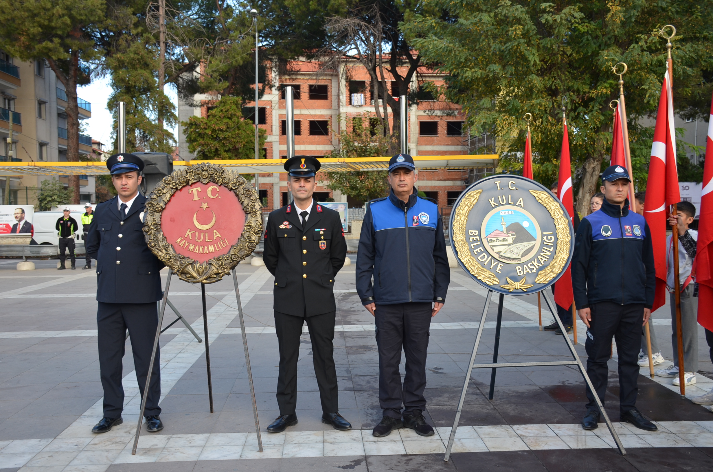 Kula Kent Meydanında bulunan Atatürk anıtı önünde başlayan anma programı ilk anıta Kula Kaymakamlığı ve Kula Belediye Başkanlığının çelenklerinin sunumuyla başladı. Saatler 09:05’i gösterdiğinde saygı duruşu ve İstiklal Marşımızın okunmasıyla Atatürk anıtı önünde program son buldu.