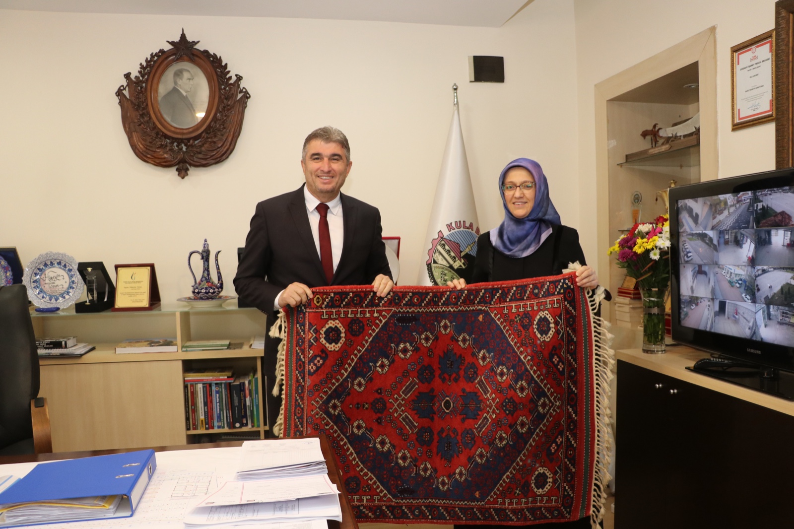MCBÜ Rektörü Prof.Dr. Rana Kibar’ın Kula ziyaretinde ilk durağı Kula Belediyesi oldu. Kula Belediye Başkanı Hüseyin Tosun’u makamında ziyaret eden Kibar’a, MCBÜ Rektör Yardımcısı Prof.Dr. Ahmet Çetin ve Kula MYO Müdürü Doç.Dr. Ahmet Yavuz Çamlı eşlik etti. Ziyarette Başkan Tosun, Rektör Kibar’a ziyaret anısına el dokuması Kula Halısı hediye etti.