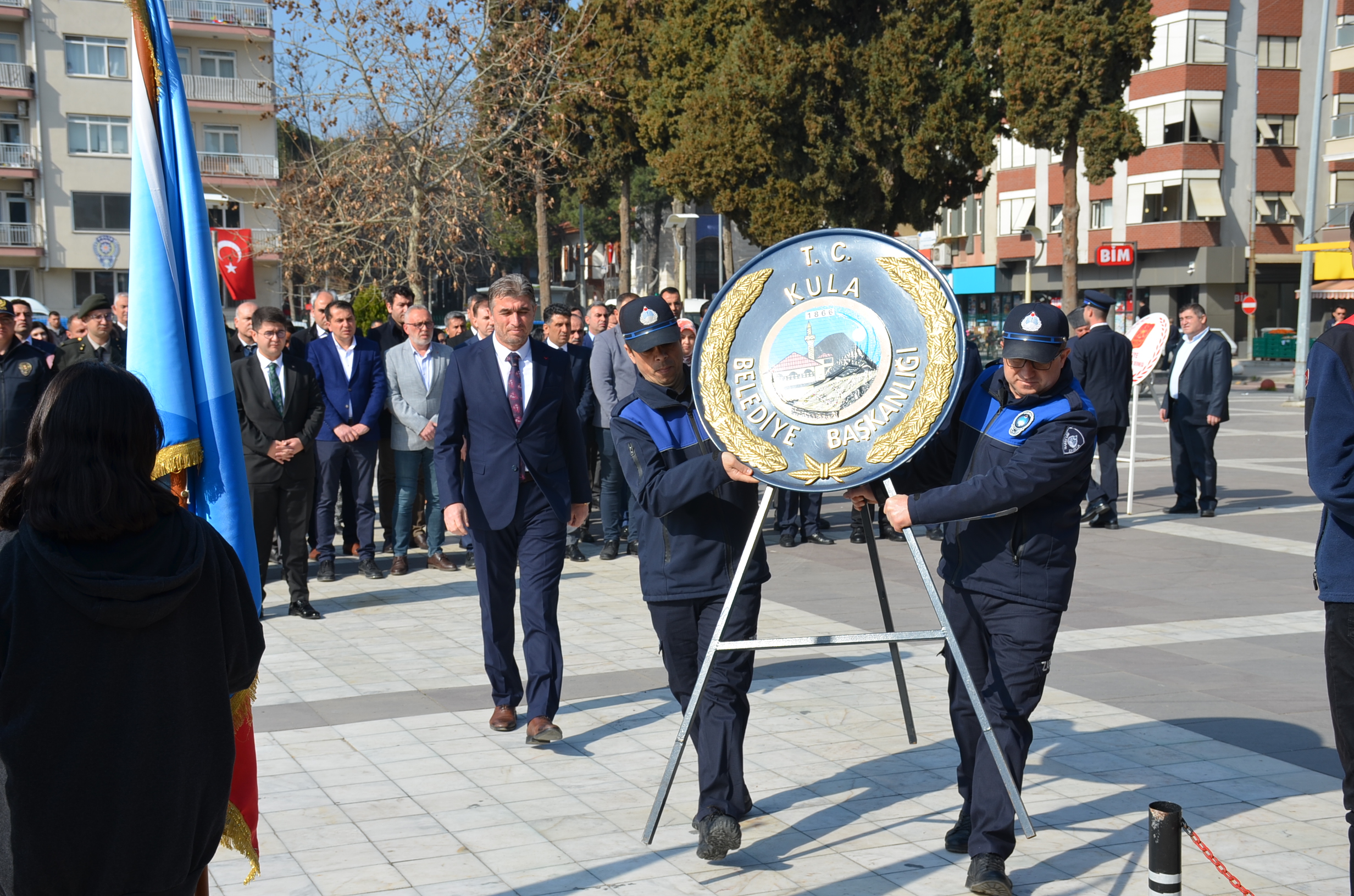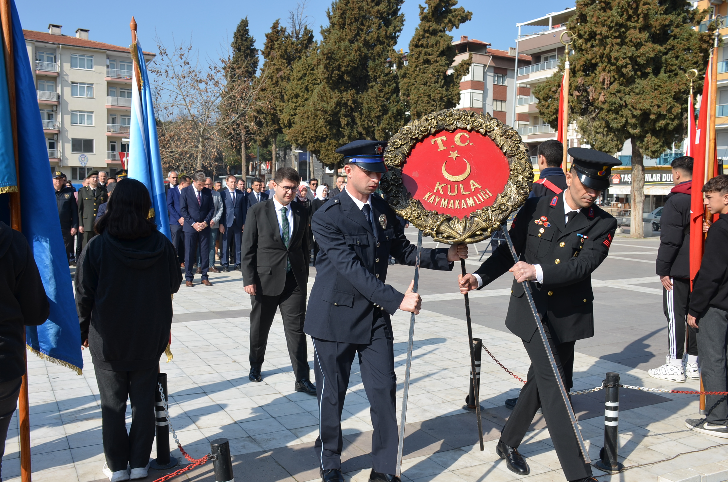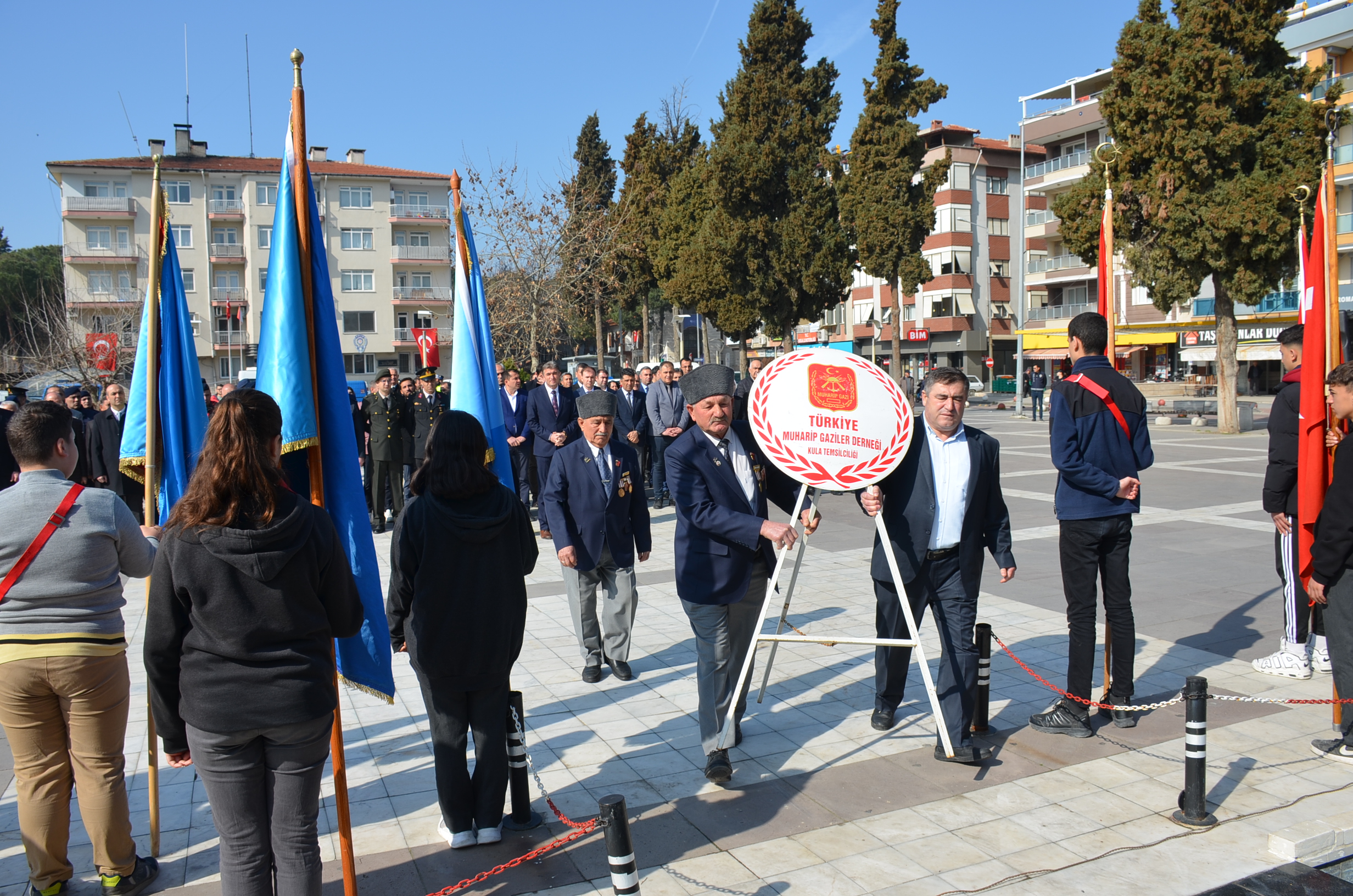 Program ilk olarak Kent Meydanında bulunan Atatürk anına çelenk sunulmasıyla başladı, çeleklerin sunumunun ardından, saygı duruşu ve İstiklal marşı okundu. Kula Şehitliğini ziyaret edildi, şehitlikte Çanakkale Şehitleri ve tüm şehitlerimiz adına Kuran tilaveti ve dualar edildi.
