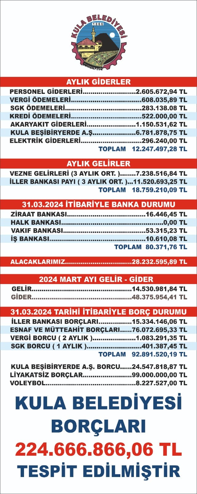 Kula Belediye Başkanı Hikmet Dönmez Kula Belediyesinin borçlarını açıkladı. Başkan Dönmez sosyal medya hesabından yaptığı açıklamada Kula Belediyesinin borlarını açıklayarak Kula halkını bilgilendirdi. Belediye Başkanı Hikmet Dönmez Kula Belediyesinin borcunun 224.666.866.06 Türk Lirası olduğunu duyurdu ve Kula Belediye kasasının boş olduğunu söyledi.