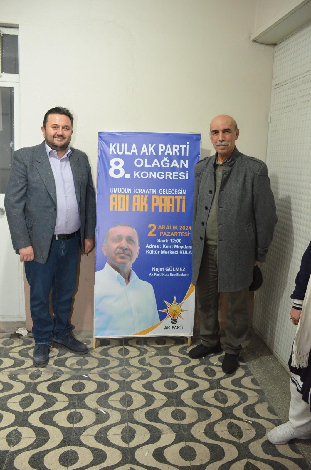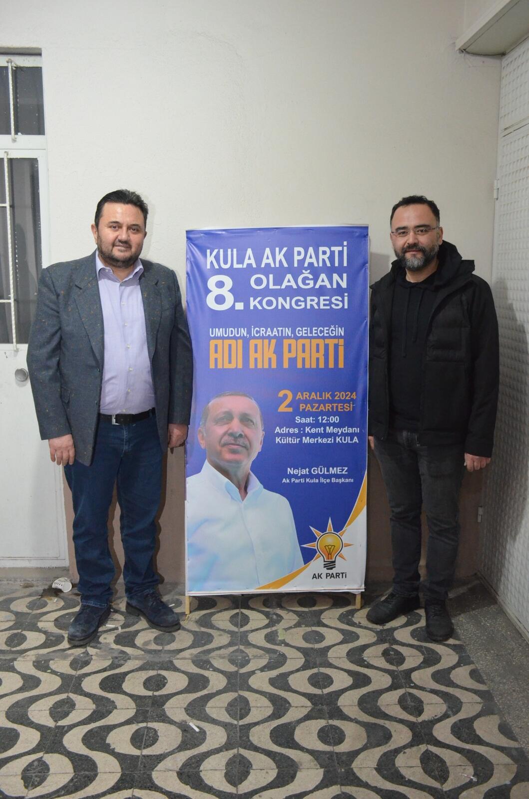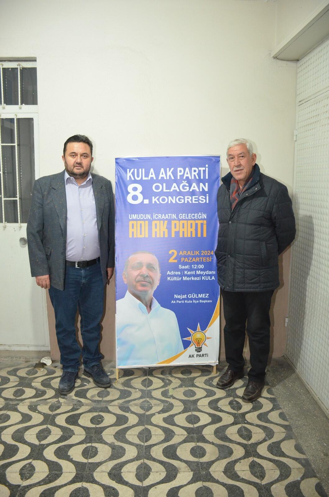 2 Aralık 2024 Pazartesi günü yapılacak olan Kula Ak Parti 8. Olağan kongresi öncesinde delegeler parti binasında bir araya geldi. 4 Ekim 2024 tarihinde Ak Parti genel merkezine çağrılarak ilçe Başkanlığı görevi verilen Nejat Gülmez teşkilatını 2 Aralık 2024 tarihinde yapılacak olan 8. Olağan kongreye hazırlamaya başladı.