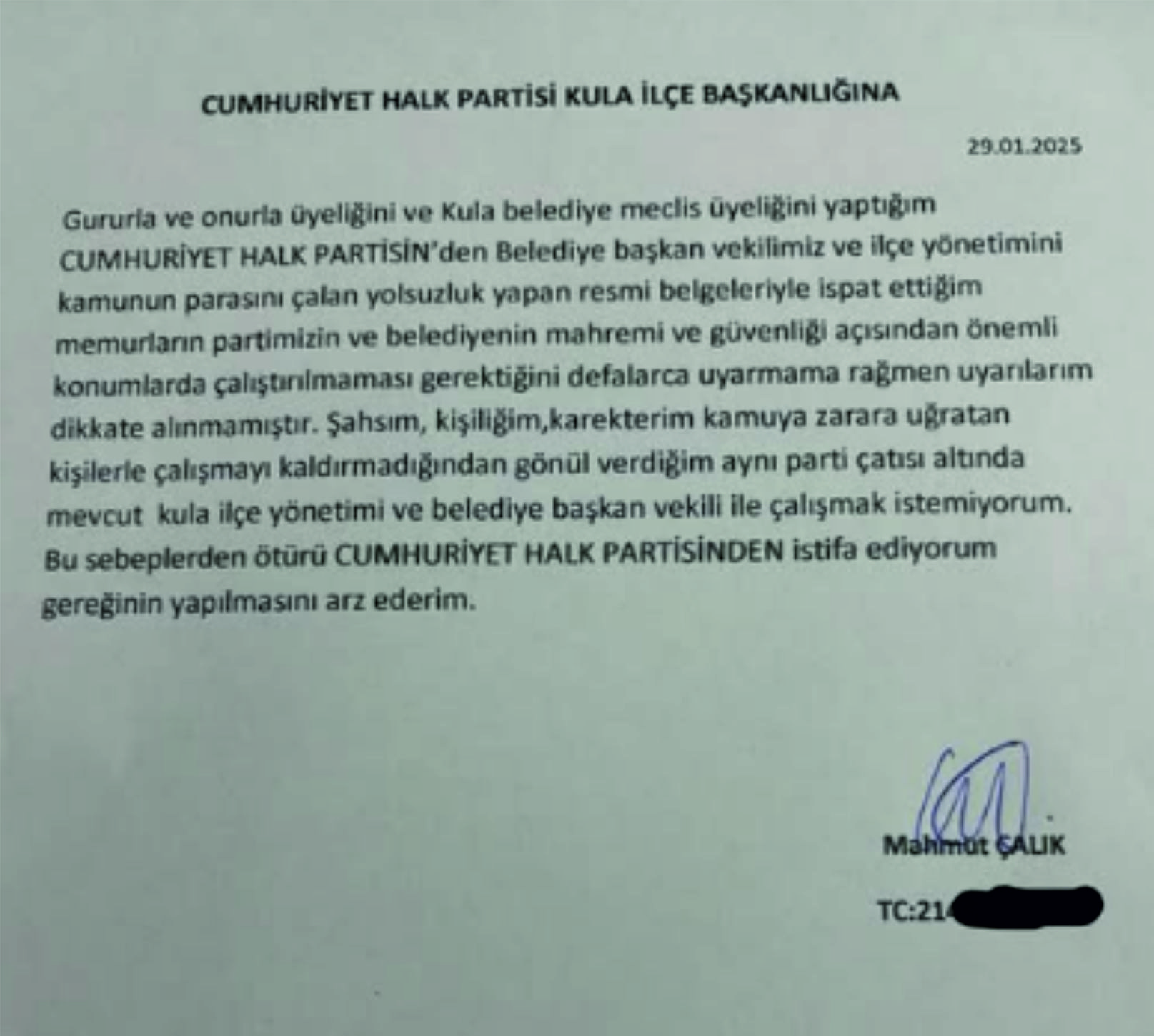 Cumhuriyet Halk Partili Kula Belediye Meclis Üyesi Mahmut Çalık sosyal medya hesabından yaptığı açıklama ile partisinden istifa ettiğini açıkladı.
