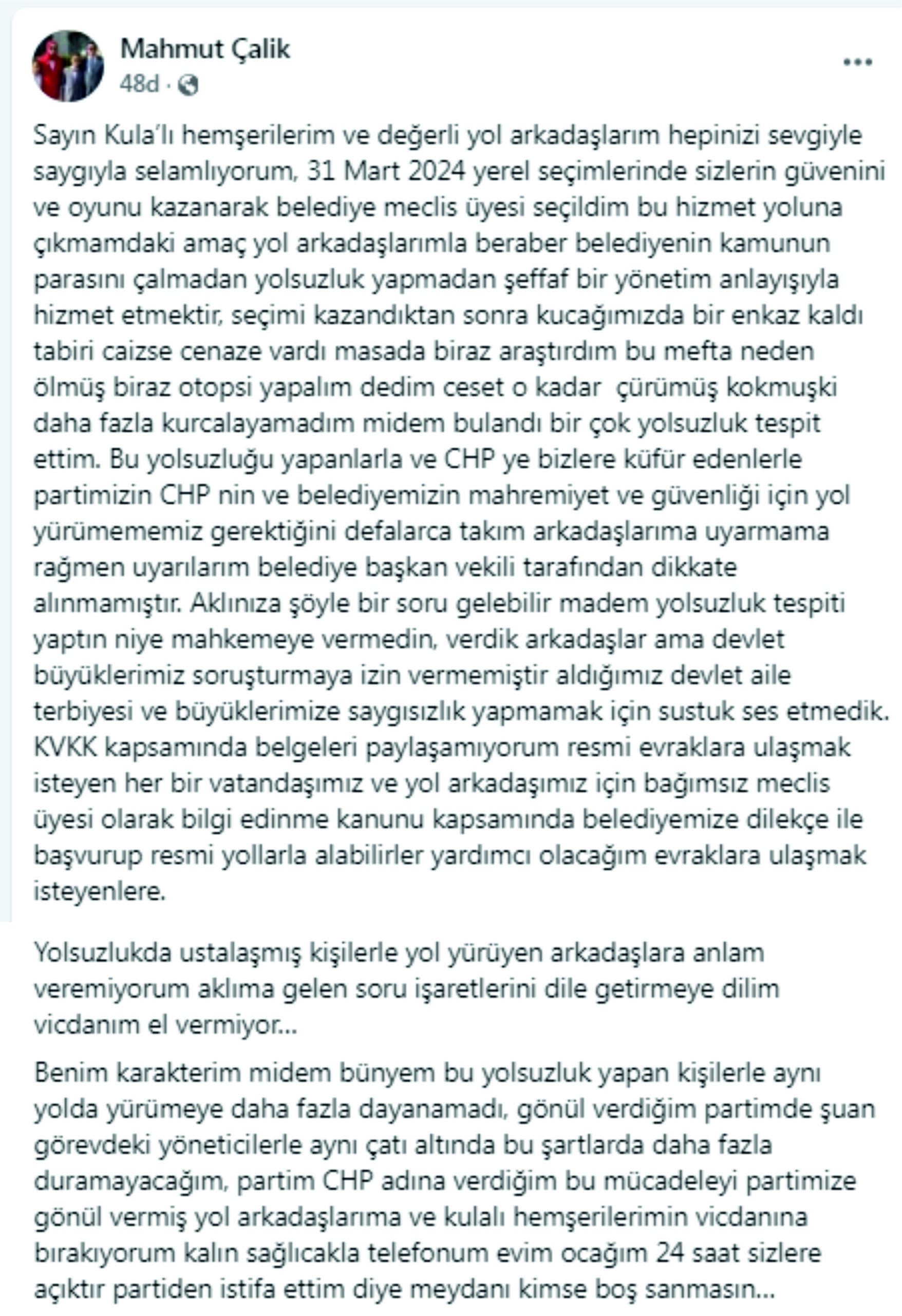 Çalık istifasına dair açıklamasın da “Sayın Kula’lı hemşerilerim ve değerli yol arkadaşlarım hepinizi sevgiyle saygıyla selamlıyorum, 31 Mart 2024 yerel seçimlerinde sizlerin güvenini ve oyunu kazanarak belediye meclis üyesi seçildim bu hizmet yoluna çıkmamdaki amaç yol arkadaşlarımla beraber belediyenin kamunun parasını çalmadan yolsuzluk yapmadan şeffaf bir yönetim anlayışıyla hizmet etmektir, seçimi kazandıktan sonra kucağımızda bir enkaz kaldı tabiri caizse cenaze vardı masada biraz araştırdım bu mefta neden ölmüş biraz otopsi yapalım dedim ceset o kadar çürümüş kokmuşki daha fazla kurcalayamadım midem bulandı bir çok yolsuzluk tespit ettim. Bu yolsuzluğu yapanlarla ve CHP ye bizlere küfür edenlerle partimizin CHP nin ve belediyemizin mahremiyet ve güvenliği için yol yürümememiz gerektiğini defalarca takım arkadaşlarıma uyarmama rağmen uyarılarım belediye başkan vekili tarafından dikkate alınmamıştır. Aklınıza şöyle bir soru gelebilir madem yolsuzluk tespiti yaptın niye mahkemeye vermedin, verdik arkadaşlar ama devlet büyüklerimiz soruşturmaya izin vermemiştir aldığımız devlet aile terbiyesi ve büyüklerimize saygısızlık yapmamak için sustuk ses etmedik. KVKK kapsamında belgeleri paylaşamıyorum resmi evraklara ulaşmak isteyen her bir vatandaşımız ve yol arkadaşımız için bağımsız meclis üyesi olarak bilgi edinme kanunu kapsamında belediyemize dilekçe ile başvurup resmi yollarla alabilirler yardımcı olacağım evraklara ulaşmak isteyenlere.