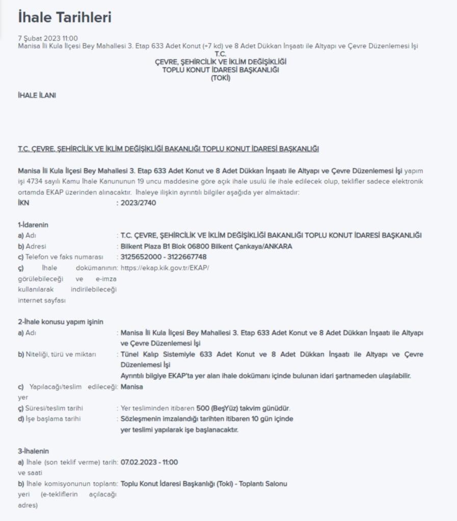 Çevre, Şehircilik İklim Değişikliği Bakanlığı Toplu Konut İdaresi Başkanlığı (TOKİ) tarafından 3. Etap Kula Toplu Konut projesi için ihale tarihi ve konut sayısı duyuruldu.