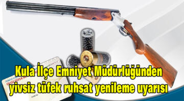 Kula İlçe Emniyet Müdürlüğünden yivsiz tüfek ruhsat yenileme uyarısı Kula İlçe Emniyet Müdürlüğü, yivsiz tüfek ruhsatnamesi geçerlilik süresi dolan vatandaşların ruhsatnamelerini yenilemeleri g...