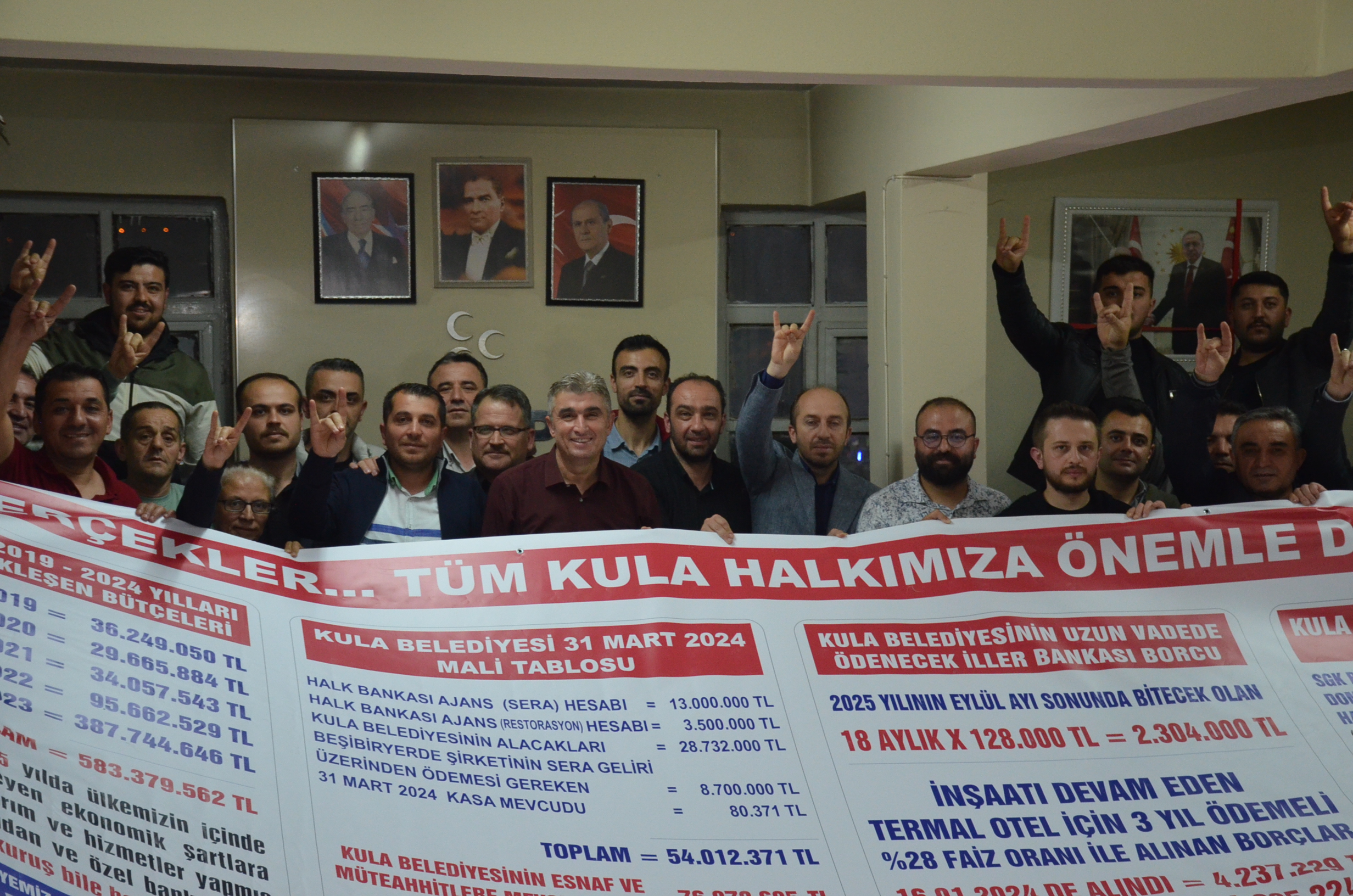 Hüseyin Tosun açıklamalarında “Değerli Kula Halkı, belediye Başkanı olarak 10 yıl hizmet makamında bulunmuş olmanın verdiği sorumluluk bilinciyle her zaman olduğu gibi bugünde şeffaf ve hesap verebilir bir anlayışla Kula Belediyesi’nin mali durumu hakkında doğru ve gerçek bilgileri sizinle paylaşmak istiyorum. Son on yılda Kula Belediyesi’nde mali disiplini sağlayıp, itibar ve değer kazandırdık, 45 bin nüfusa sahip bir ilçe belediyesi olarak birçok il belediyesinin ulaşamadığı bütçe rekorları kırdık ve bununla birlikte şehrimize uzun yıllar hizmet edecek, katma değer sağlayacak milyonlarca liralık yatırım ve eser kazandırdık.