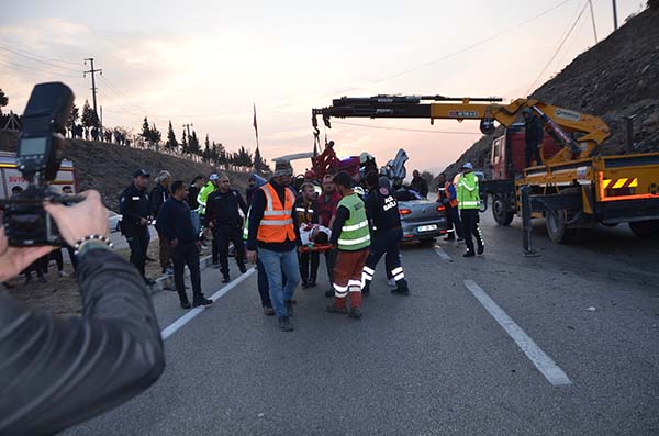 Otomobil sürücüsü Buğra Kök ve Hatice Kök (27) ağır yaralı, yolcu olarak bulunan Ercan Kök (54) ve Metehan Dutar (3) ile traktör sürücüsü Turgut Tomas yaralandı.