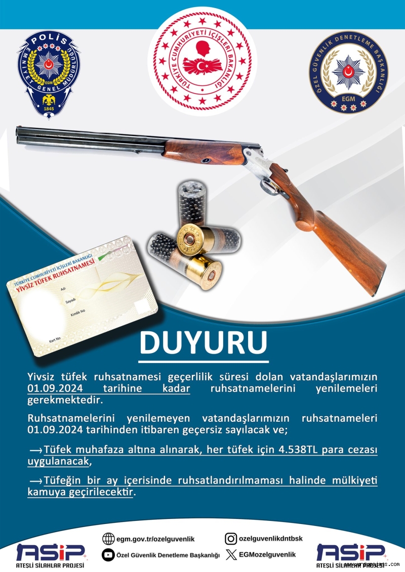 Kula İlçe Emniyet Müdürlüğü’nden yapılan açıklamada; “Yivsiz tüfek ruhsatnamesi geçerlilik süresi dolan vatandaşlarımızın 01.09.2024 tarihine kadar ruhsatnamelerini yenilemeleri gerekmektedir.