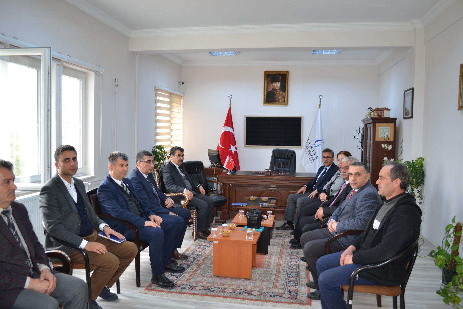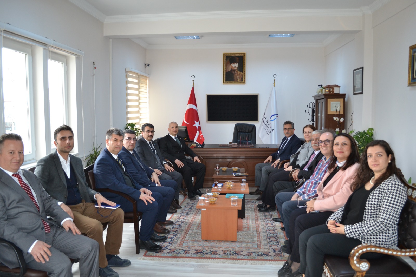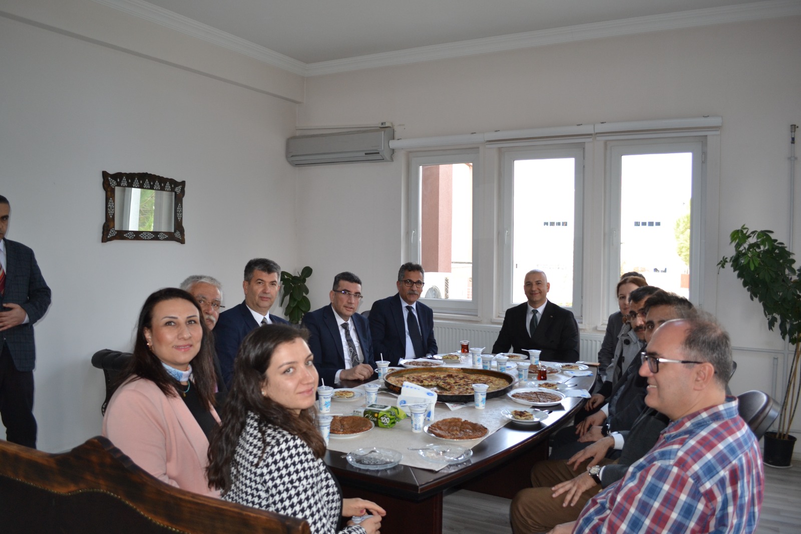 Daha sonra idari binaya geçen misafirler Müdürlük Makamına nezaket ziyaretinde bulundular. Misafirlere okul yönetimi tarafından Kula’nın ünlü su böreği ve şekerli pidesi ikram edildi. İkramların ardından Üniversite üst yönetimi idari ve destek personelleri ile görüşmeler gerçekleştirip çalışanların taleplerini aldı.