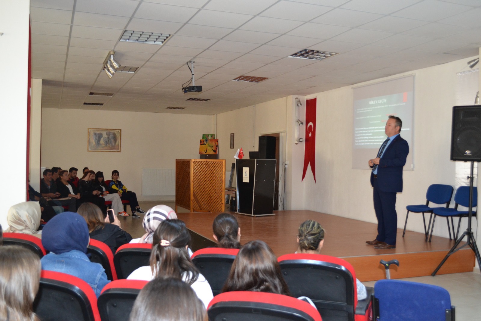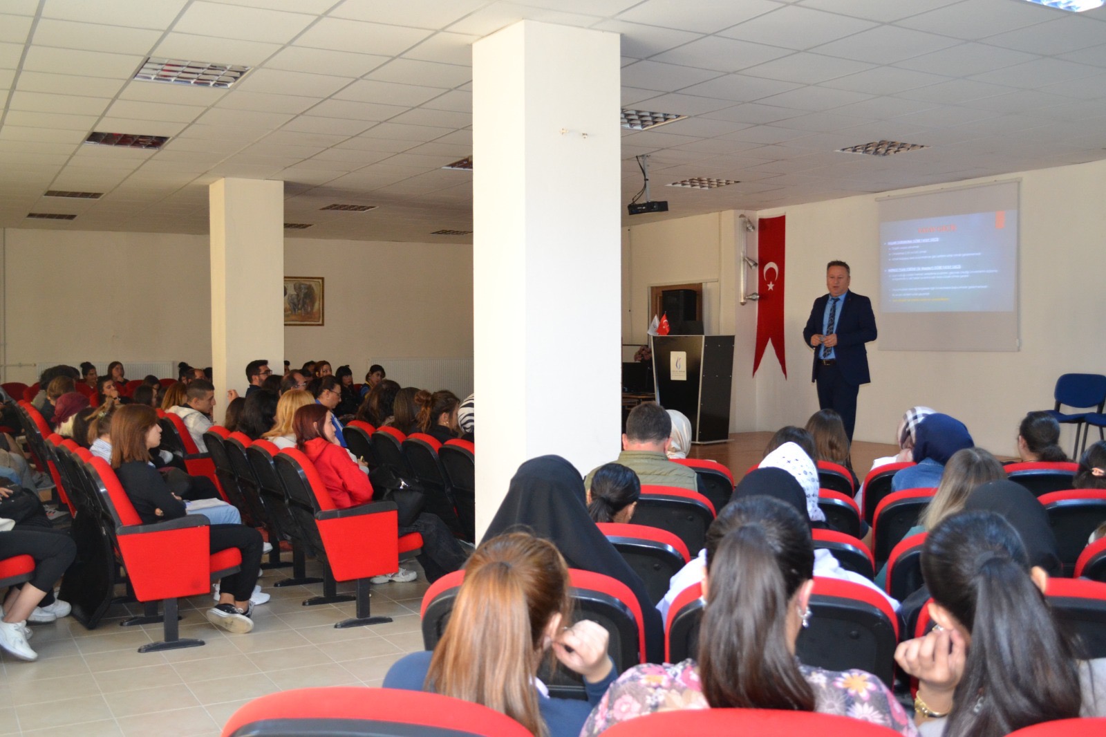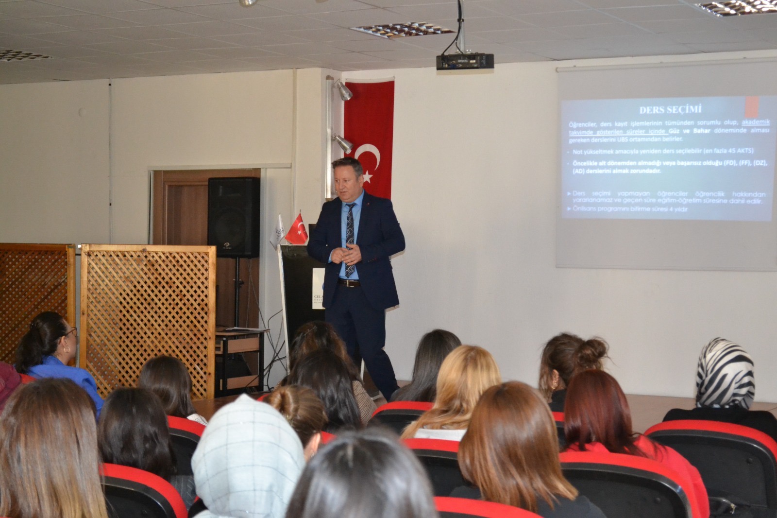 Yeni kayıt yaptıran öğrencilerin akademik yıl bilgisi, üniversite faaliyetleri ve ders bilgilerinin verildiği toplantıyı meslek Yüksek Okulu Sekreter Vekili Hasan Ali Şahin verdi.