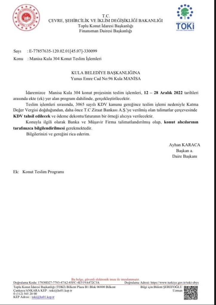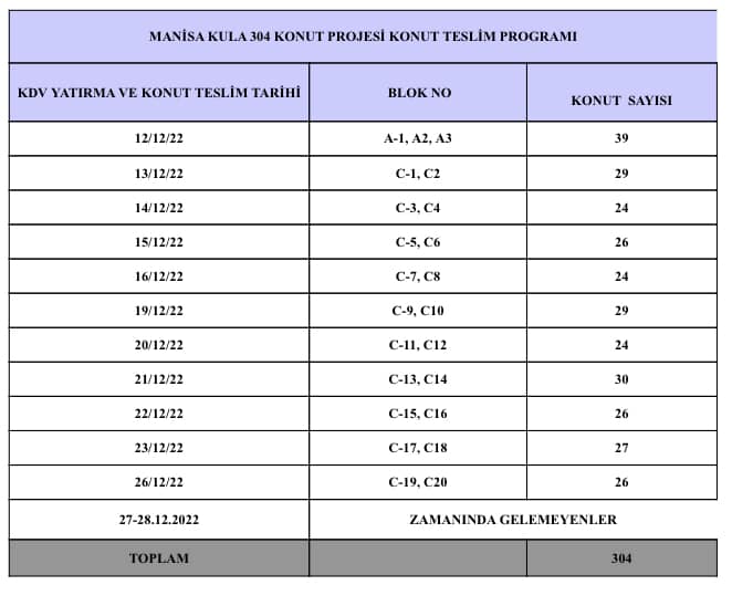 Toplu Konut İdaresi Başkanlığının (TOKİ) yaptığı resmi açıklamaya göre, “Kula 304 Adet Konut Projesi kapsamında yer alan konutların hak sahiplerine teslimi 12 – 28 Aralık tarihleri arasında alıcılarına teslim edilecektir” denildi.