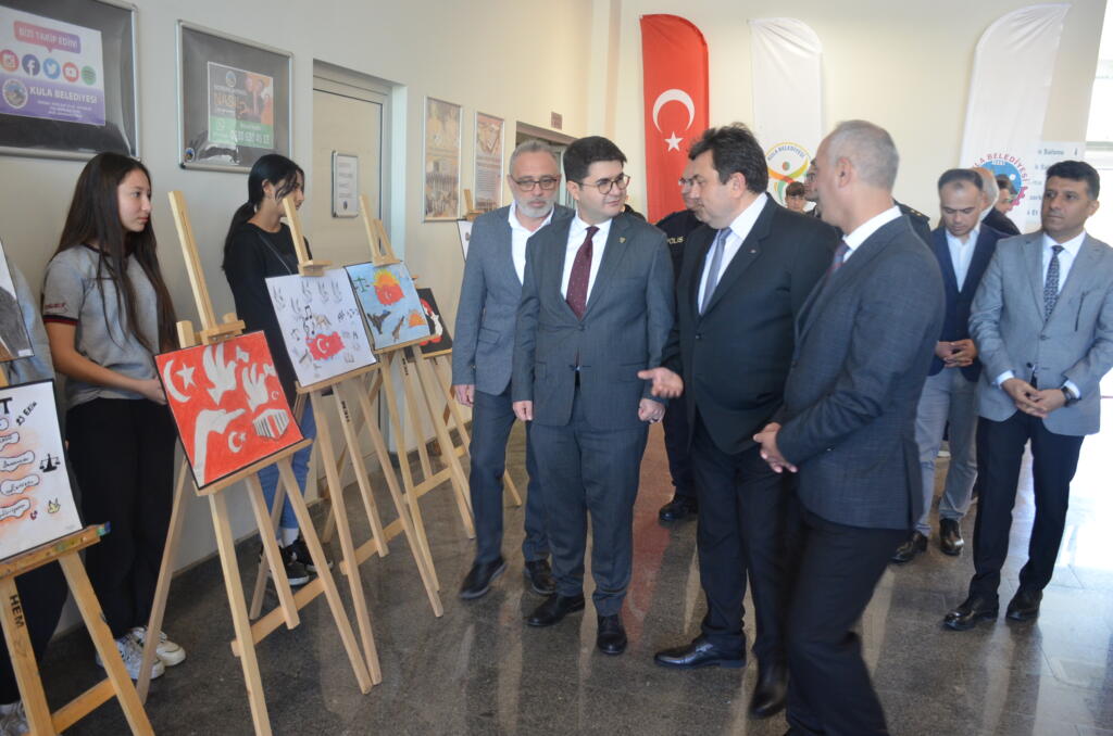 Cumhuriyetin 100. yıl kutlamaları, Kula ilçesinde Kula Belediyesi ve İlçe Milli Eğitim Müdürlüğü tarafından hazırlanan “Cumhuriyet Emin Ellerde” temalı 19,23 metrekarelik dev tuvale okul öncesi öğrencilerinin parmak boyama etkinliği ile başladı. Kula Yunus Emre ve Şehit Ömer Halisdemir Kent Meydanı’nda sabahın erken saatlerinde başlayan etkinlik, Cumhuriyet çocuklarının ilgisini çekti. Kula Kaymakamı Ömer Ahmet Özdemir başkanlığında Cumhuriyet Bayramı kutlama komitesi ve Kula Halkı’nın katılımıyla Yunus Emre Kültür Merkezi’nde Yunus Emre Anadolu Lisesi tarafından hazırlanan ‘Cumhuriyet ve Atatürk’ resim sergisi açılışı ardından 15 Temmuz Şehitleri İmam Hatip Ortaokulu ve Halit Okul İmam Hatip Lisesi tarafından 29 Ekim Cumhuriyet Bayramı salon etkinliği düzenlendi. Konferans Salonu’nda gerçekleşen kutlama etkinliğinde saygı duruşunda bulunulması, İstiklal Marşı’nın okunması, Türkiye Muharip Gaziler Derneği Kula Şubesi adına Kıbrıs Gazisi İsmail Kara tarafından Cumhuriyet’in 100. yılının anlam ve önemine dair konuşma yapılması, Kula Belediye Başkanı Hüseyin Tosun’un kutlama mesajını içeren 100. Yıl temalı kısa film, sinevizyon gösterileri, Kuran-ı Kerim tilaveti, şiirler, ilahiler okundu, müzik dinletisi icra edildi.