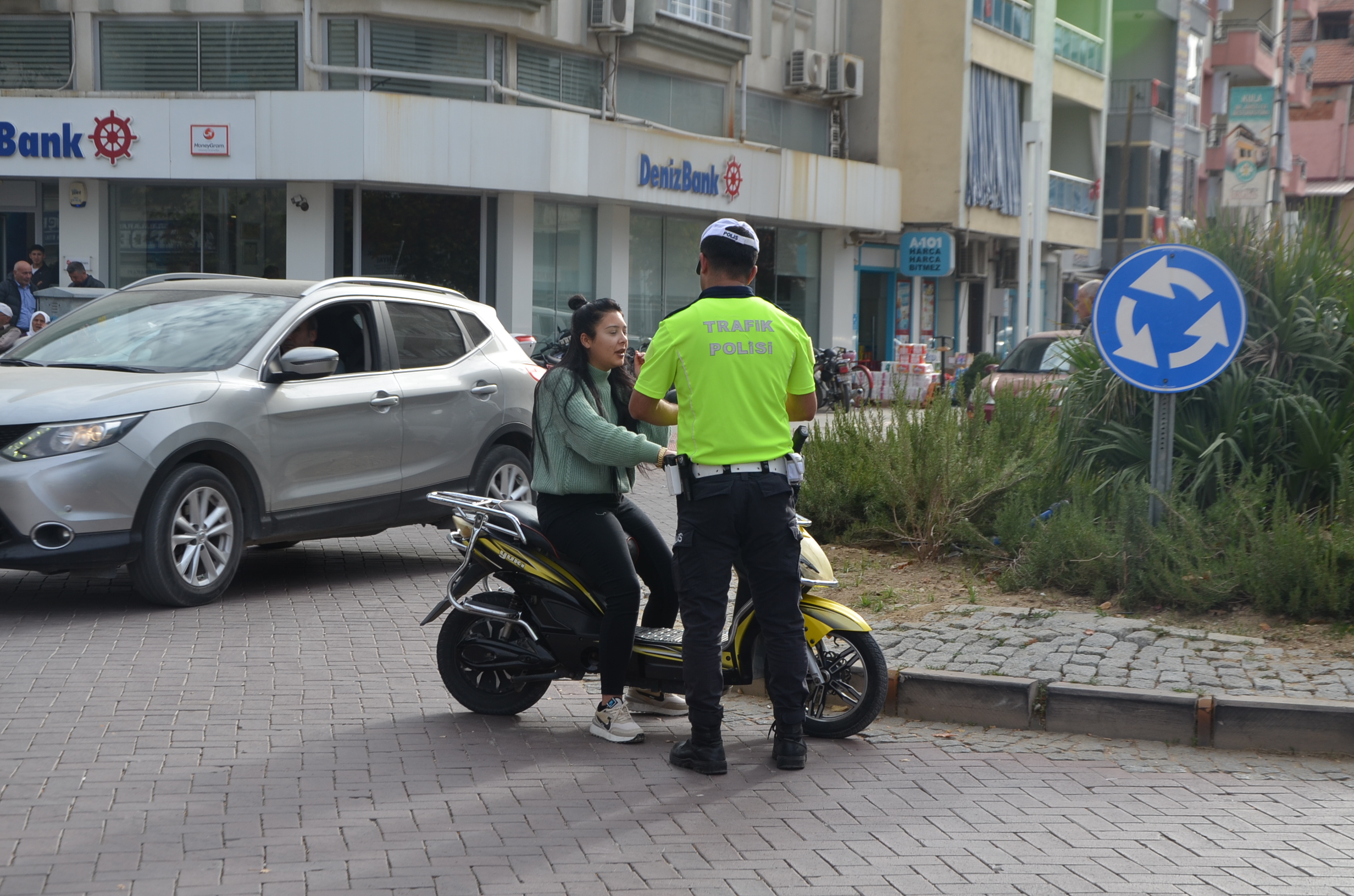 Alançeşme kavşağındaki uygulamada motosiklet sürücülerinin yanı sıra yaya geçitlerinde yayaya yol vermeyen sürücüleri de cezai işlem uyguladı.