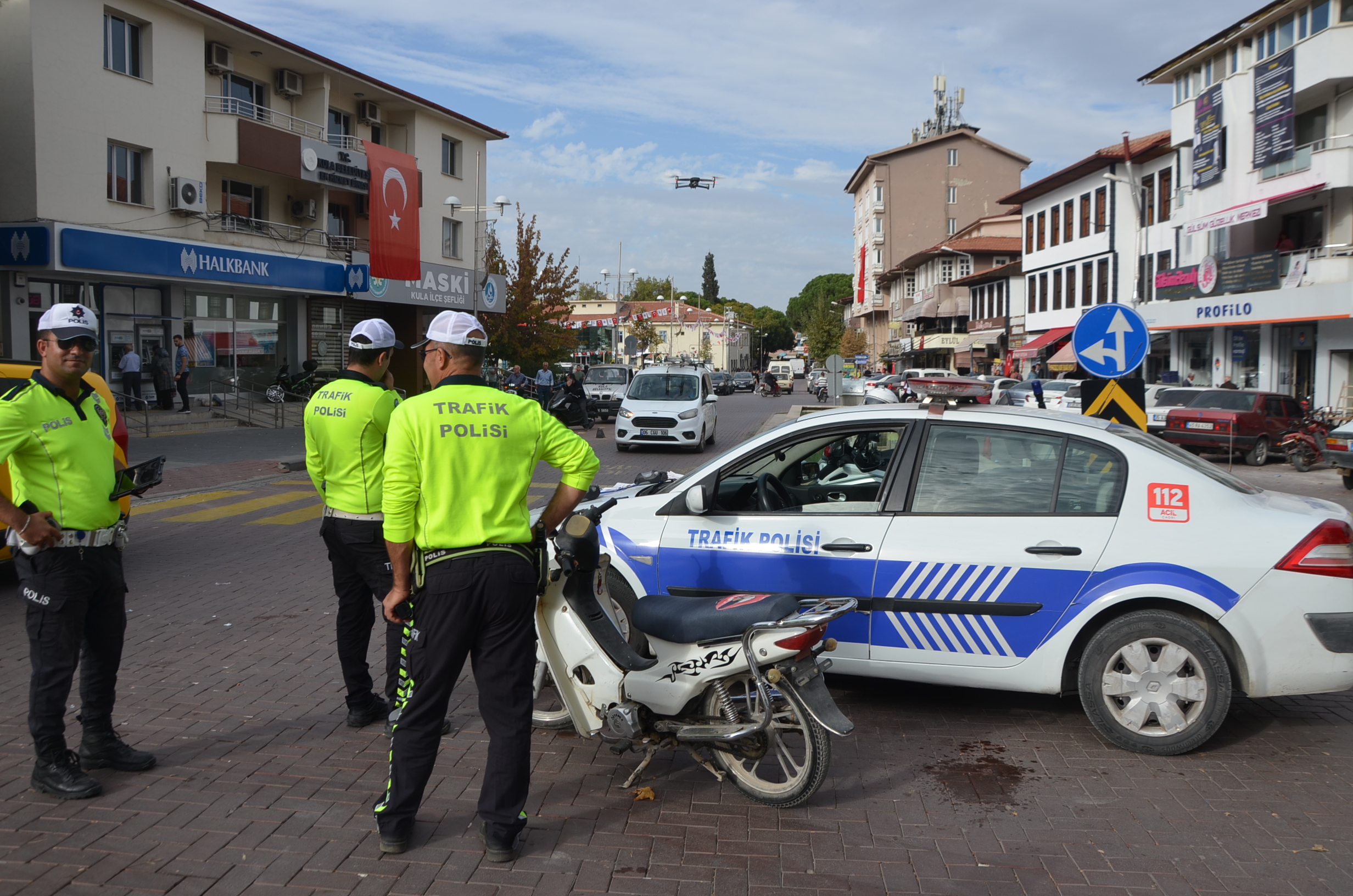 İlçenin farklı noktalarında Drone ile gerçekleştirdikleri denetimlerde plakasız, kasksız, egzozu açık ve eksik evrakla trafiğe çıkan motosikletlere cezai işlem uygulanırken, sürücülere de uyarıda bulunuldu.