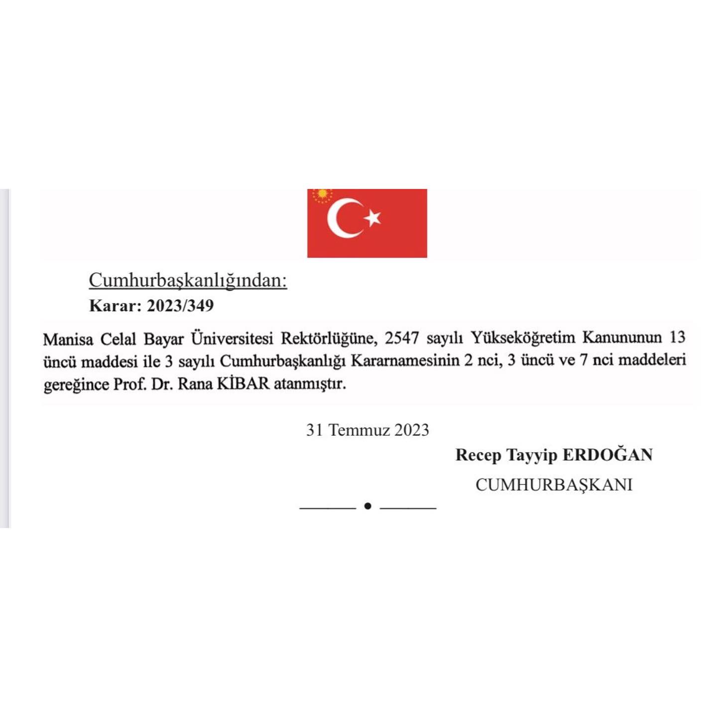 Cumhurbaşkanlığı kararnamesi ile YÖK’e 5 yeni üye atanırken, Manisa Celal Bayar Üniversitesi Rektörlüğüne Akhisar Tütün Eksperliği Meslek Yüksek Okulu Müdürü ve Fen Edebiyat Fakültesi Fizik Bölümü Öğretim Üyesi Prof. Dr. Rana KİBAR atandı.