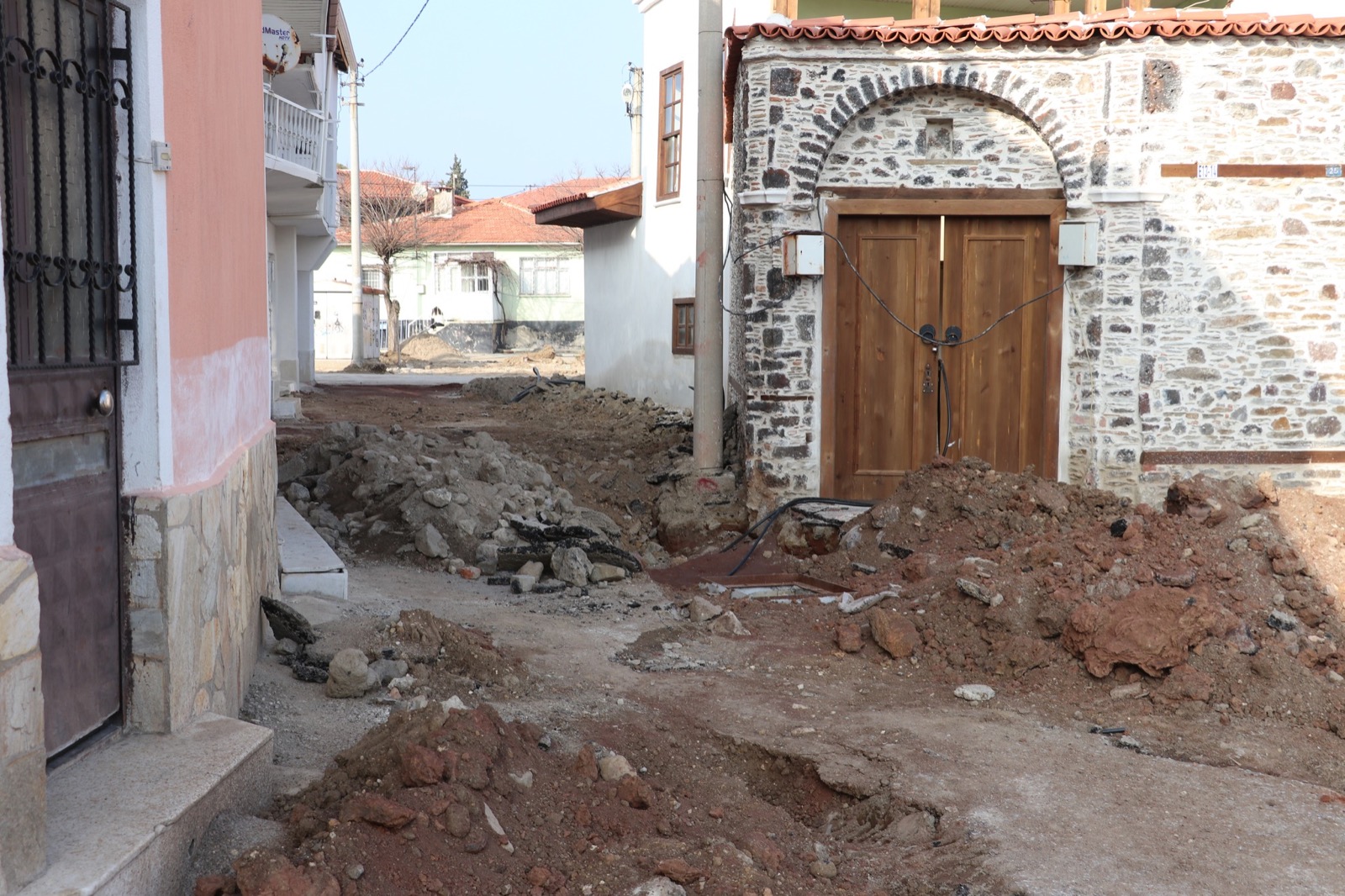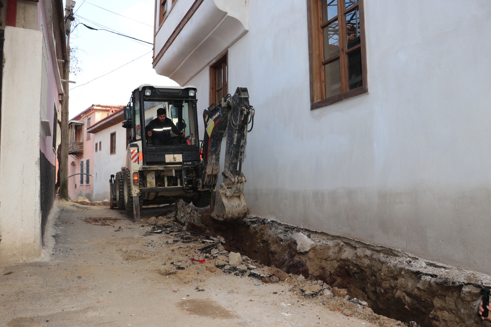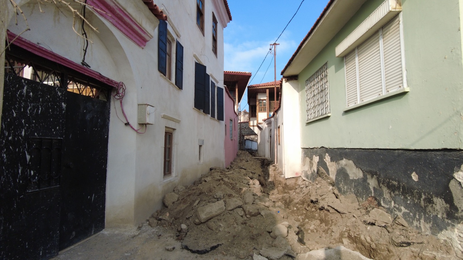 Kula’nın eski yerleşimlerinden olan ve çok sayıda tescilli yapının bulunduğu Mustafa Şapçı Sokak’ta cephe sağlıklaştırma uygulamaları devam ederken bir taraftan da altyapı dönüşümü sürüyor