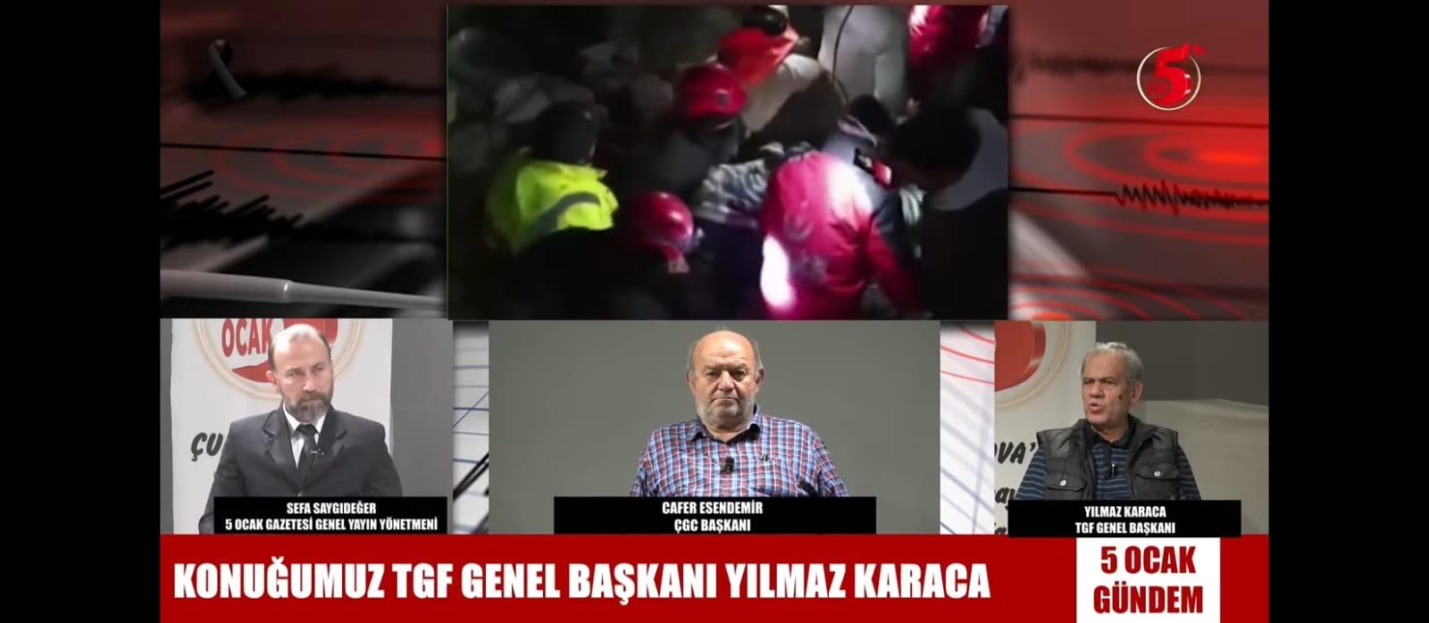 Cemiyetin sosyal tesislerinde kalan deprem mağduru gazeteciler ve vatandaşlara geçmiş olsun dileklerini ileten Genel Başkan Yılmaz Karaca, daha sonra Genel Başkan Vekili Cafer Esendemir ile birlikte 5 Ocak TV’de canlı yayına katılarak Gazeteci Sefa Saygıdeğer’in sorularını yanıtladı.