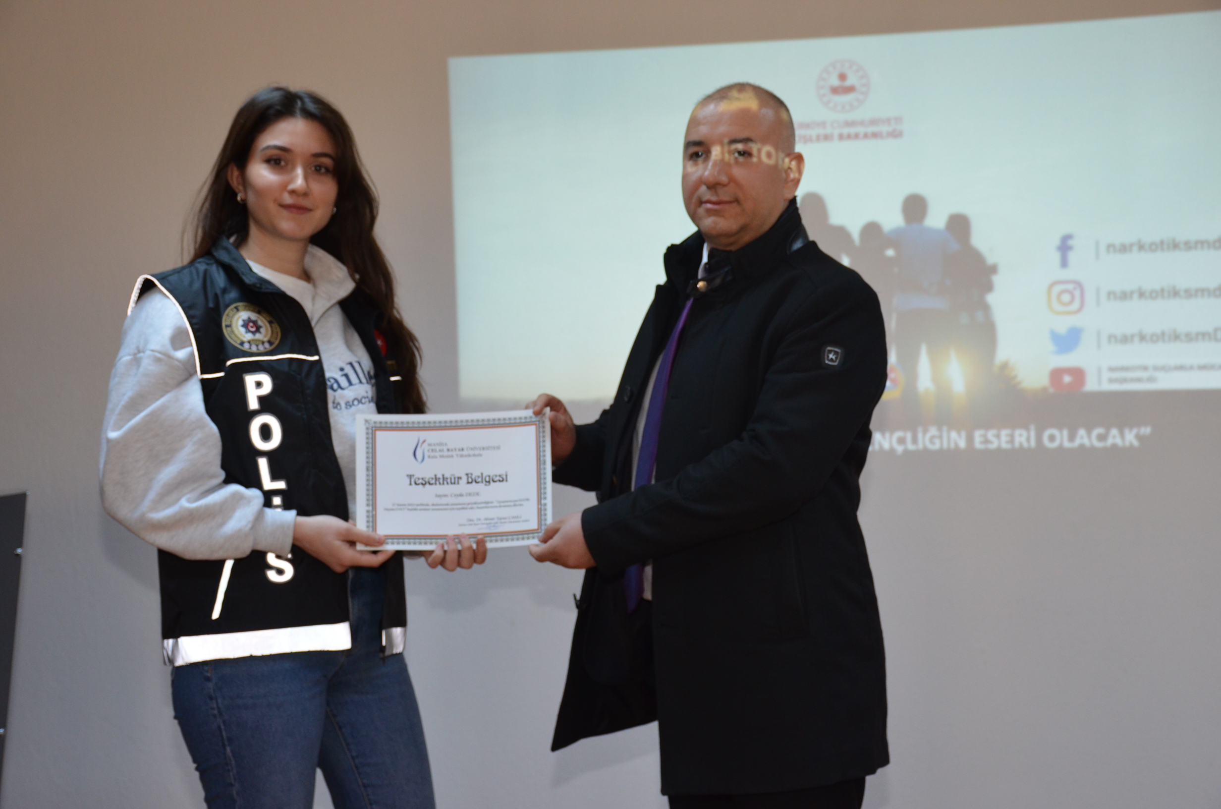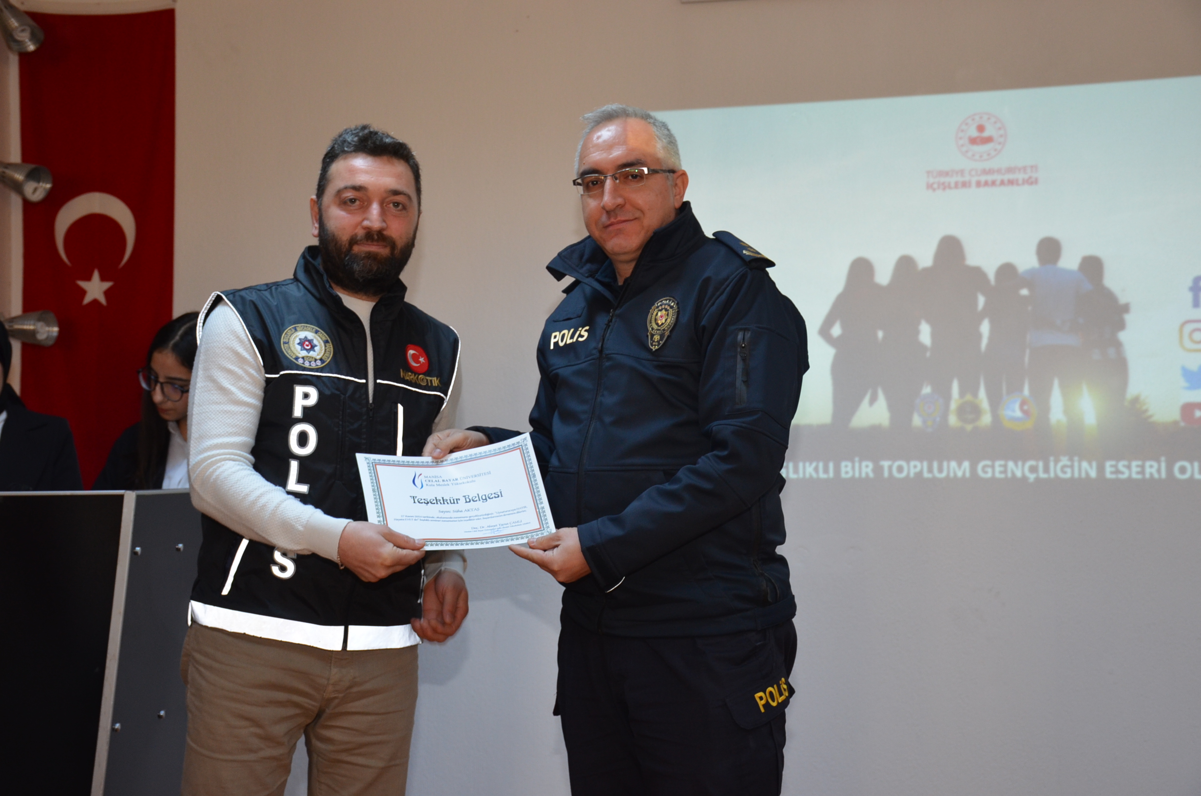Manisa İl Emniyet Müdürlüğü Narkotik Suçlarla Mücadele Şube Müdürlüğü Salihli Büro Amirliği tarafından Celal Bayar Üniversitesi Kula Meslek Yüksekokulu Öğrencilerine Uyuşturucuya “HAYIR”, hayata “EVET” de! Semineri verildi.